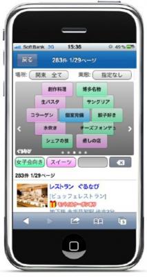 また、「お店のウリ検索」は、スマートフォンのタッチ操作の利便性を生かし、検索ワードを入力することなく、表示される単語を次々とタッチしていくだけで、心地よく楽しくお店が探せる操作性が特徴です。なお、「お店のウリ検索」は、4月15日よりiPhoneで、5月16日からはAndroidでスタートします。