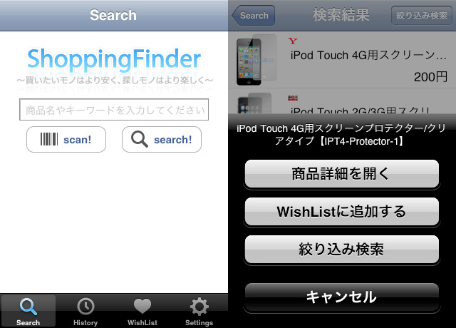 iPhone版の特徴としては、バーコードからの検索に対応、そのまま各モールでの購入も可能なるなど、スマートフォン利用に合わせて使い勝手が向上しています。