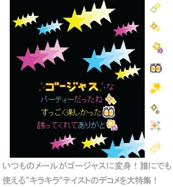 コンテンツ内容:いつものメールがゴージャスに変身!誰にでも使える“キラキラ“テイストのデコメを大特集!