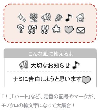 コンテンツ内容:「!」「ハート」など、定番の記号やマークが、モノクロの絵文字になって大集合!