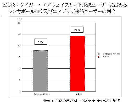 しかし、ユニークユーザー数の推移の比較だけでは、今後LCCが世界の航空業界を席巻していくと結論付けるのは早計です。大きな成長を見せているタイガー・エアウェイズはシンガポール航空の子会社であり、ハイブランドのシンガポール航空とLCCであるタイガー・エアウェイズの2つのブランドを一つのグループで提供することが、旅客者のニーズを包括的にカバーするための戦略であると伺えます。実際にタイガー・エアウェイズのサイト来訪ユーザーのうち、約18%が親会社であるシンガポール航空のサイトを併せて来訪しているのに対して、約24%のユーザーがエアアジアのサイトを来訪しています。(図表3)