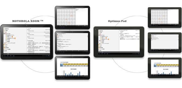 タブレット型端末の大画面で、ネイティブアプリにも負けない操作性と視認性を提供。本格的な業務をセキュアにおこなうことができます。まずはOptimus Pad(NTTドコモ)とMOTOROLA XOOM(au)の2機種に対応! 順次、他のAndroid 3.0端末にも対応していきます。
