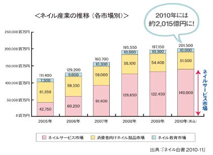 2010年度、JNA(日本ネイリスト協会)ネイル白書調べによると、ネイル市場は2,000億円を超えるマーケットに成長。