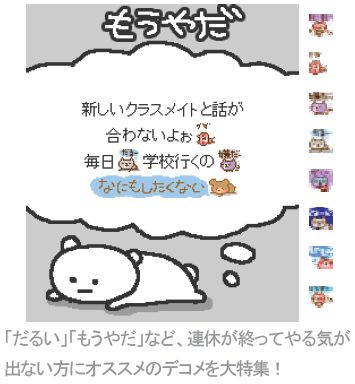 コンテンツ内容:「だるい」「もうやだ」など、連休が終ってやる気が出ない方にオススメのデコメを大特集!