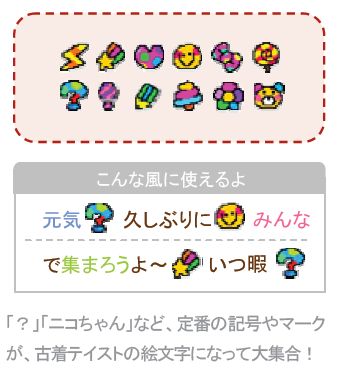 コンテンツ内容:「?」「ニコちゃん」など、定番の記号やマークが、古着テイストの絵文字になって大集合!