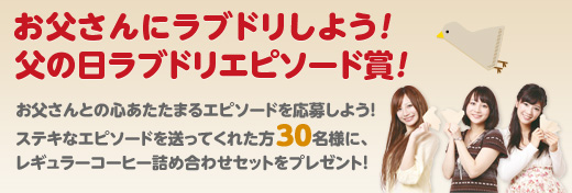 当会は父の日に向けて、お父さんとレギュラーコーヒーに関する心温まるエピソードを募集いたします。厳選な審査の下、特に素敵なエピソードを応募された30名様を「父の日ラブドリエピソード賞」として表彰すると共に、お父さんに感謝の気持ちをこめてコーヒーをいれるための、レギュラーコーヒー詰め合わせセットをプレゼントいたします。