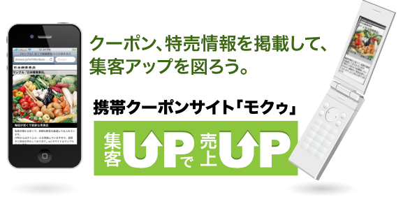 携帯クーポンサイト「モクゥ」は、ドコモ、au、Softbankの3G携帯電話に加えて、スマートフォン、PCにも対応した携帯クーポンサイト「モクゥ」(http://mocoo.jp/)です。