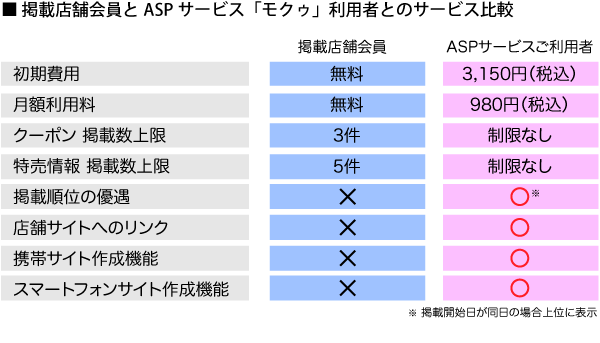「掲載店舗会員」は、初期費用、月額利用料などの費用が一切かからず、携帯クーポンサイト「モクゥ」への掲載が可能です。