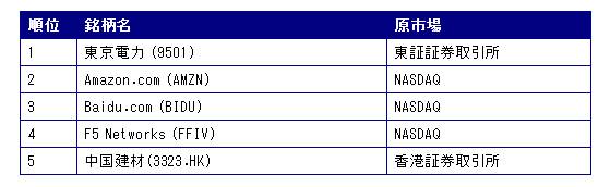 個別株CFDでは株価が急落した東京電力が取引金額において1位となりましたが、2位から5位まではNASDAQ及び香港証券取引所の銘柄が占め、低迷する国内株ではなく、海外銘柄に対しての注目が集まっている事が見て取れます。