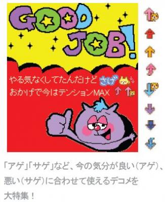 コンテンツ内容:「アゲ」「サゲ」など、今の気分が良い(アゲ)、悪い(サゲ)に合わせて使えるデコメを大特集!