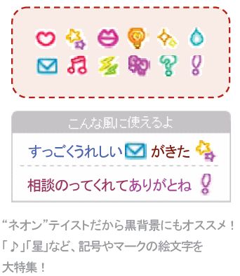 コンテンツ内容:“ネオン”テイストだから黒背景にもオススメ!「♪」「星」など、記号やマークの絵文字を大特集!