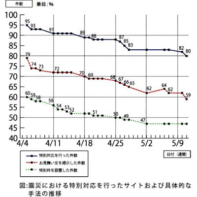 ※なお、ここでいう「特別な情報発信」とは、ニュースリリース掲載など、通常運営の範囲での震災対応は含まず、レイアウトやメインビジュアルの変更、特設枠の設置等、大きな変更を伴う対応を行ったサイトのみを対象とした。