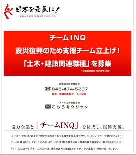 インキュベクスでは、復興支援のため、土木施工管理技士など、土木・建築関連人材を被災地に派遣する準備を進めており、賛同する全国のパートナー企業とともに新会社「チームINQ合同会社」(所在地:神奈川県横浜市、代表社員:インキュベクス株式会社)と、その東北支店(所在地:宮城県仙台市、支店長:鈴木耕平)を5月10日に設立、登記を行いました。また、新会社設立を受け、土木・建築関連人材の採用活動を本格化しています。