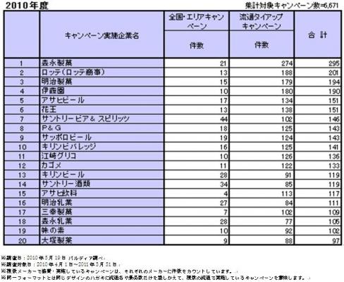 今回の調査で1位となったのは森永製菓株式会社で、キャンペーン実施件数は295件(表3参照)。森永製菓株式会社は2009年度の1年間を対象とした調査結果に引き続き首位を維持しています。
