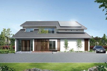 アエラホーム姫路店は、白い壁と木質感豊かな縦格子の対比や二段大屋根が印象的な和モダンタイプのモデルハウスです。田園風景にも都市景観にも違和感ないデザインになっています。