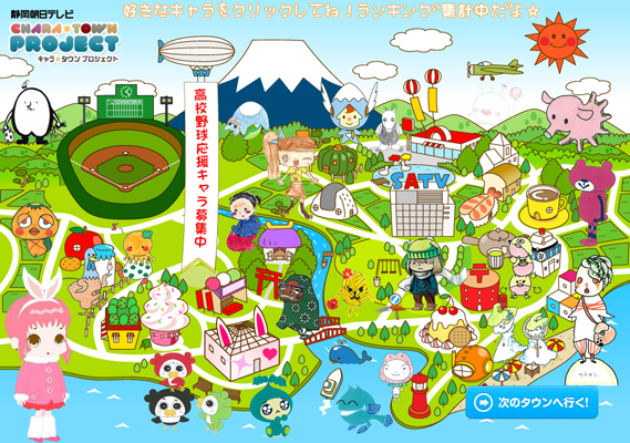 キャラタウン★プロジェクトは、本年1月から静岡朝日テレビで運営を開始し、本サイトをキャラクターの見本市とすることで、プロアマ問わず、キャラクターデビューを目指し、これまで多くの応募をいただいて参りました。応募いただいたキャラクターは、本サイトで紹介すると共に、静岡朝日テレビのイベントPRや各種プロモーションでの利用やコンテンツの販売を進めております。