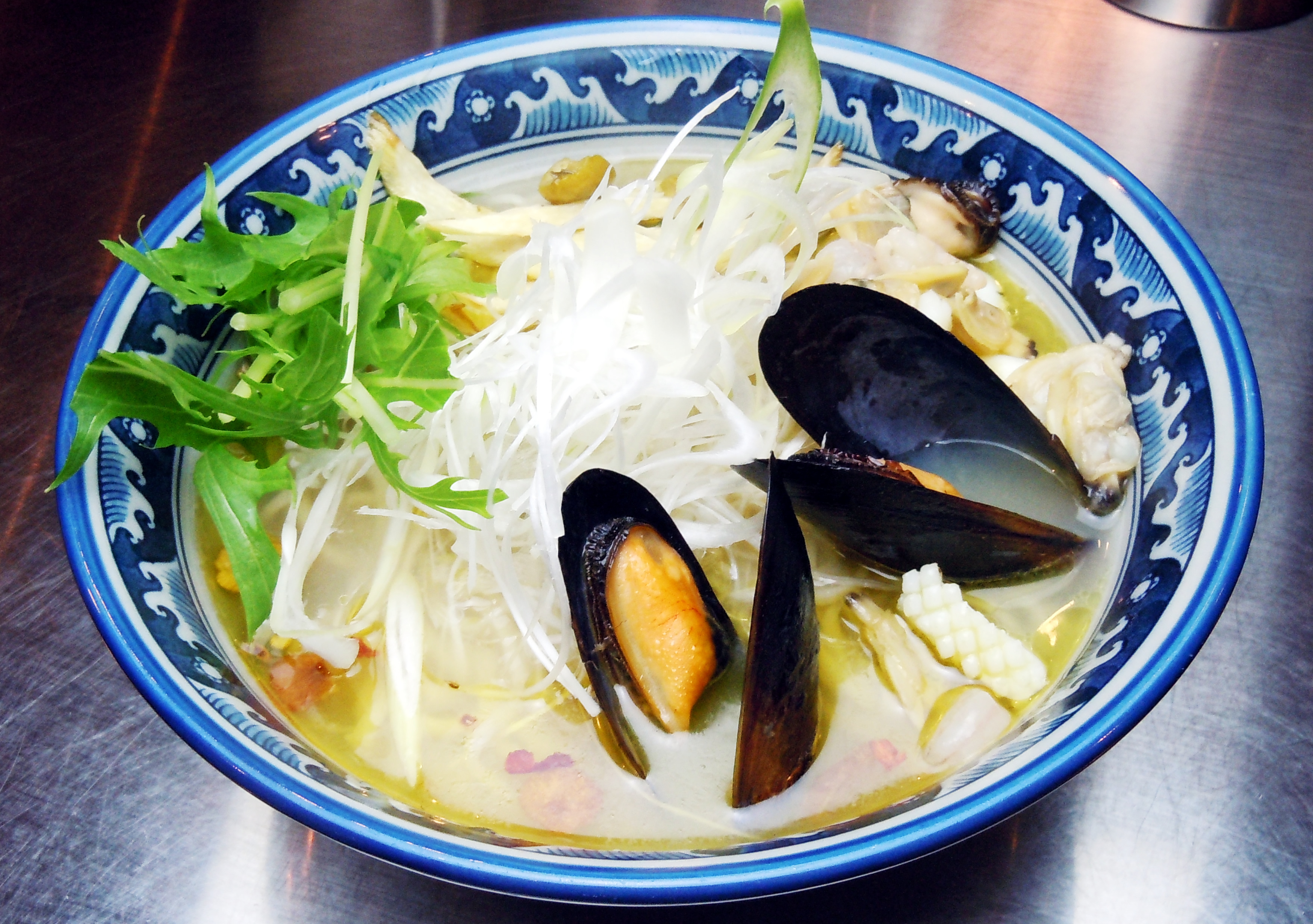 トッピングは、ムール貝・あさり・エビ・イカと、大勝軒50周年の限定麺にふさわしい