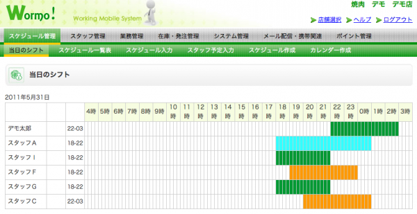 登録時の自動送信メールに記載されているIDなどでログイン後、スタッフ登録などを行い、所定の日付などにシフト入力をすることで、スタッフが携帯端末から勤務日・勤務時間・各種情報を確認できるようになります。