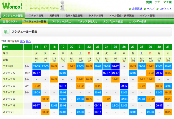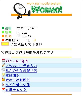 登録時の自動送信メールに記載されているIDなどでログイン後、スタッフ登録などを行い、所定の日付などにシフト入力をすることで、スタッフが携帯端末から勤務日・勤務時間・各種情報を確認できるようになります。