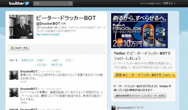 マネジメントの父、ピーター・ドラッカーの“金言”を毎日つぶやくボットサービス。現在、14万人以上にフォローされている。