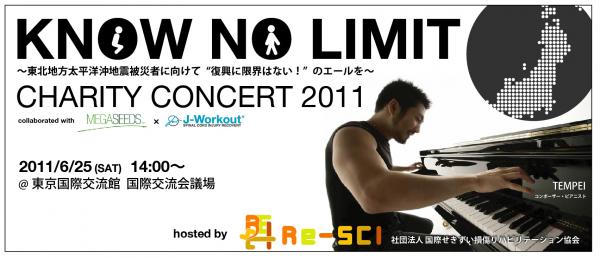 社団法人国際せきずい損傷リハビリテーション協会(所在地:東京都江東区豊洲、理事長:伊佐拓哲、http://re-sci.or.jp/index.html)は、来る6月25日(土)、東日本大震災被災者支援チャリティーコンサート「“KNOW NO LIMIT” CHARITY CONCERT 2011」を、国際交流館にて開催し致します。