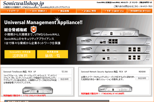 Sonicwallショップは、SONICWALL社の「TotalSecure TZシリーズ」「NSAシリーズ」を専門に販売し導入前の質問などについては、専任スタッフによる極め細かいサポートを行っております。導入後においてはソフトバンクBB社による電話・メールサポートなどを受ける事が可能で導入前から導入後まで万全のサポートを提供致しております。