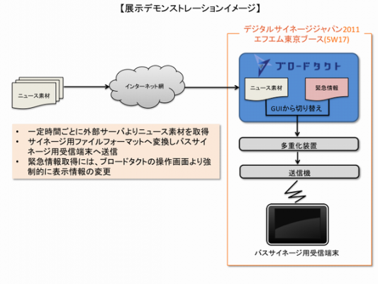 株式会社エフエム東京のブースでは、同社が2011年3月まで福岡ユビキタス特区にて行っていたV-LOW3セグメントマルチメディア放送の実証実験の1つであるバスサイネージ端末やパーソナルサイネージ端末に対して放送波を使ったコンテンツ更新の展示を行っております。今回、バスサイネージ端末に対してのコンテンツ更新に『ブロードタクト』の外部データ連携機能を活用し、ニュースや緊急情報などの配信を行っております。