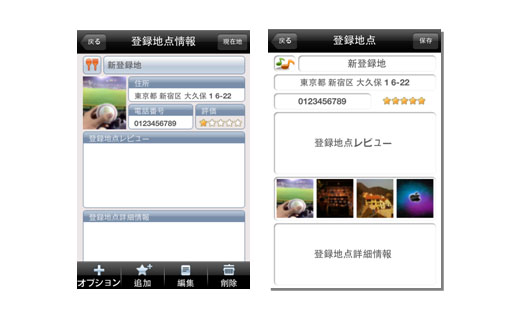 登録地点機能では、保存したい場所の住所、電話番号だけではなく、重要度、写真や特徴等までも