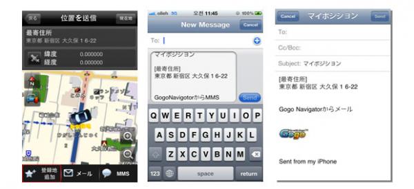 「Gogo Navigator」なら、自身の現在地を、メールまたはMMSで仲間に送ることも可能です。また、