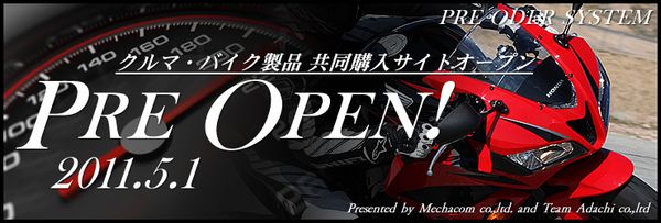 株式会社めっちゃ.com(所在地:大阪府大阪市北区、代表者:金居 勤)は、バイクカスタムの専門店として有名で、かつ自社製品を多数販売する、株式会社TEAM ADACHI(所在地:大阪府池田市、代表者:安達 龍造)監修・協賛のもと、2011年5月1日よりクローズドβバージョンとしてプレオープン中の、クルマ・バイク商品を専門に取り扱う共同購入型サイト『PRE-O MOTORS(プレオモータース)』を、同年6月1日よりオープンβバージョンとして一般公開いたしました。