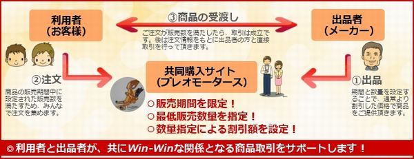 一般的な「共同購入型」サービスと同様に、お客様は欲しい商品について取引を成立させるために、様々なコミュニケーションツールを利用して商品の宣伝を行い注文を集めます。