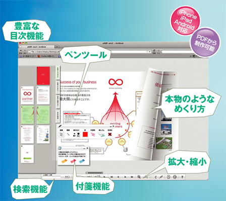 また、目次機能、文字検索機能、付箋機能、ペンツールといった充実した機能や、本物の本をめくる様な質感でiPhone/iPad/Androidからも閲覧することが可能です。