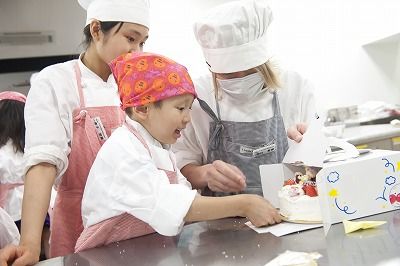 当日は、保育園の年長クラスの園児9名が参加し、クッキー、チョコレート、ホイップクリームなどを駆使しながら一人一人が自分の好きなデコレーションを行いました。コックコートへの着替えからはじまり、道具の使い方、デコレーションの仕方など、学生がマンツーマンでレクチャー致しました。約2時間かけ、1人1台のホールケーキのデコレーションを完成させ、ケーキを入れるプレゼントボックスも各自オリジナルのものを作りました。