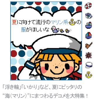 コンテンツ内容:「浮き輪」「いかり」など、夏にピッタリの“海(マリン)”にまつわるデコメを大特集!
