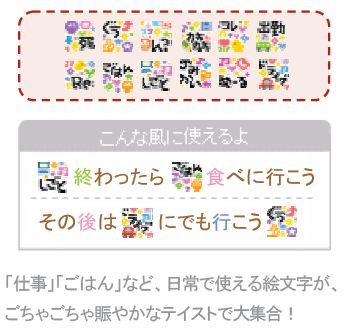 コンテンツ内容:「仕事」「ごはん」など、日常で使える絵文字が、ごちゃごちゃ賑やかなテイストで大集合!