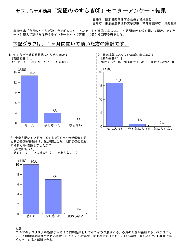 一ヶ月間聞いてもらったモニターアンケートでは90%の人が、今迄よりもイライラが解消できた。また心身の緊張を解消できそうである。と答えてくれている。