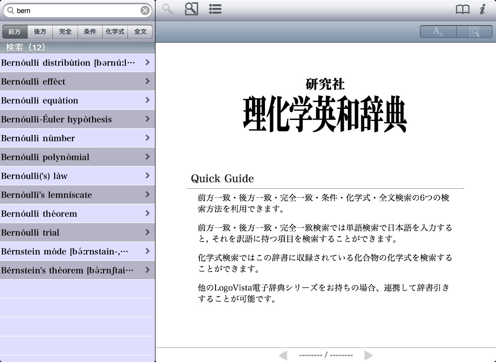 LogoVista電子辞典で培った検索方法を継承。前方一致/後方一致/完全一致/条件検索/化学式検索/全文検索/絞り込み検索-元素記号・科学式/絞込といった豊富な検索オプションを利用できます。文字を入力すると候補見出し語が表示されるインクリメンタルサーチに対応。(全文検索、絞り込み検索を除く)