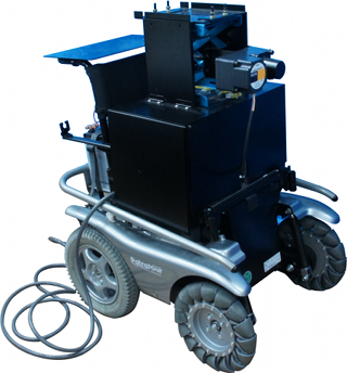 3Dレーザースキャナー等を搭載すれば、移動・計測が自由自在になり、作業者の負担を軽減することができる。また、オプションの昇降装置により2段階以上の高さを変えた計測も行える。
