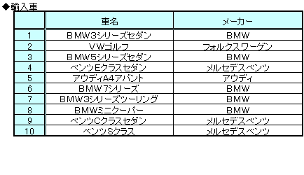 輸入車部門では、1位にBMW3シリーズセダン(BMW)、2位にVWゴルフ(フォルクスワーゲン)となりました。3位のBMW5シリーズセダン(BMW)は輸入車部門の出品ポイントで1位、10位のベンツSクラス(メルセデスベンツ)は2位でした。また、5位のアウディA4アバント(アウディ)は成約率が50ポイント、8位のBMWミニクーパー(BMW)は44ポイントとなっています。