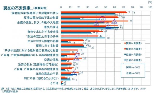 ◆原発・放射能・電力および食品に関する「不安」は継続してはいるが、全般的には各種の不安感は4月調査より減少した。近畿では浜岡原発停止を受けて夏場の電力に関する不安が上昇した。<図1>