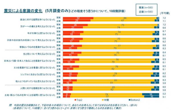 震災を受けて消費者の「意識」も変化しており、近畿より関東に意識の変化が見られる。「政治への疑問」「万が一への備え」「今が大事」などが高くなっている。<図3>