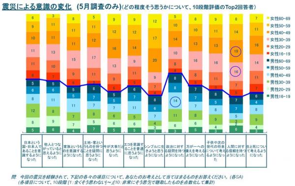 意識の変化は女性に多く見られる。「人間に対する信頼」は30代・40代女性、「政治に疑問は40代男性が多い。<図4>