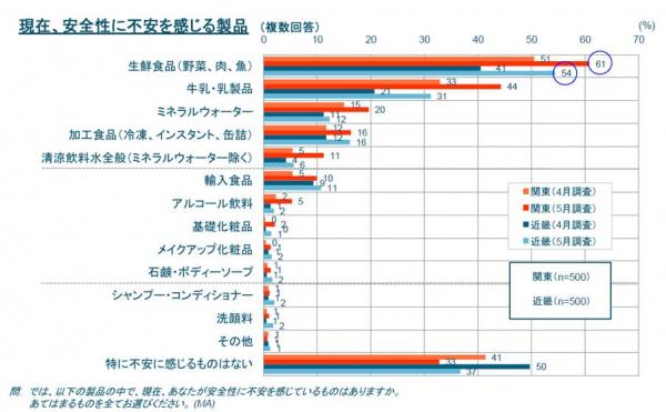 4月調査に比べ、関東・近畿ともに、「食の安全性」への不安は増加した。<図2>
