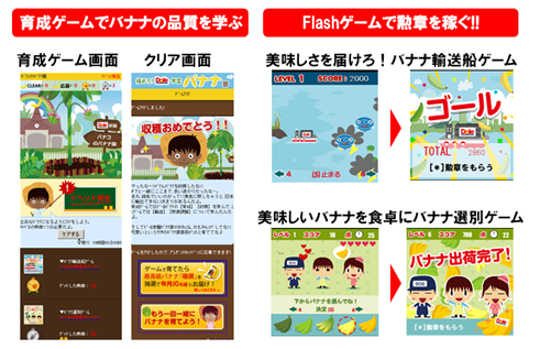 育成ゲームは、ユーザーを飽きさせないようFlashミニゲームで獲得できる「勲章」を使って育てる構造としています。FlashミニゲームはDoleのバナナ輸送船の船長になって収穫したバナナを、サメや台風などの障害物を上手くかわしながら目的地まで届ける「美味しさ届けろ!輸送船ゲーム」と、Doleの営業マンになり、お店の人が希望する熟成状態のバナナを素早く選んで渡す「美味しいバナナを食卓に!バナナ選別ゲーム」の2種類を用意しました。主婦やその子供という幅広いターゲット層に直観的に遊んで貰え、ストレスなく操作できるように視認性・操作性を高めたゲーム内容となっています。