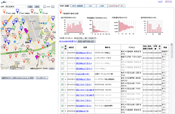 そこで、JAPAN-REIT.COMでは、この作業を迅速化するために、地図と一覧が一度に作成できるツールを開発し、Webブラウザのみで利用できるASPサービスとして提供を開始いたしました。
