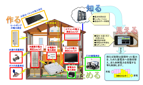 従来の無線を使った宅内家電や分電盤の「電力の見える化」に加え、各機器の遠隔制御のみならず、電力の使用量に応じたアラームの機能を搭載し、電力使用抑制の促進、蓄電池から集約した 貯まった電力量・使用可能時間、充電状況等の情報管理、さらに太陽光発電による発電量及び消費量の計測情報管理等、電力を「知る」、「制御する」、「ためる」といった機能を実現する。