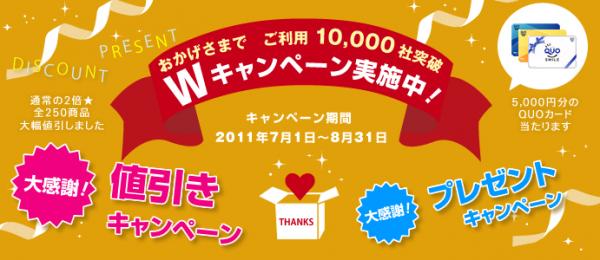 2008年6月のWEBサイト開始から4年。皆様に支えられ、ご利用社数1万社(行政機関・各種団体・個人を含む)を超えることができました。日頃のご愛顧に感謝を添えたダブルキャンペーンを期間限定で開催いたします。各キャンペーンの概要は下記のとおりです。