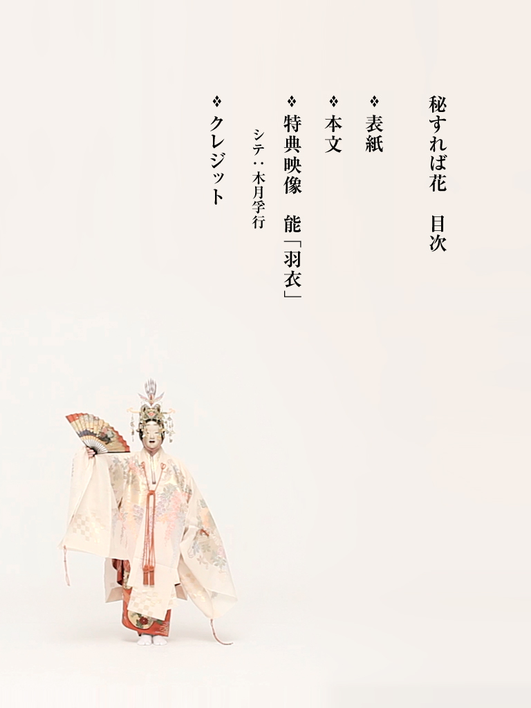 能という伝統的な日本の美と、現代的な映像表現を組み合わせた表紙映像に加え、能「羽衣」の抜粋を特典映像として収録。