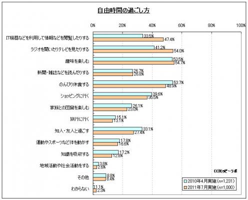 「自由時間の過ごし方」についてモバイルリサーチで聞いたところ、「IT機器などを利用して情報を閲覧する」「ラジオを聞いたりテレビを見たりする」が昨年と比べて10ポイント以上増加していることがわかった。東日本太平洋沖地震の発生後、原発問題の進展や生活用品の安全性など各メディアから積極的に情報収集する人が増えた結果とみられる。逆に「知人・友人と過ごす」は5ポイント減少しており、周りの人とコミュニケーションをとる機会は減っていることがわかった。