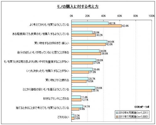 「モノの購入に対する考え方」について聞いたところ、「よく考えてからモノを買うようにしている」が昨年と比べて15ポイント以上増加していることがわかった。東日本太平洋沖地震発生直後の買い占め問題や放射能の影響による食品類への不安などにより、消費者が購買に対して慎重になっていることを表す結果となった。また、「ある程度高くても良質のモノを購入するようにしている」も5ポイント増加しており、以前よりも「質」を重視する人が増えて消費者の目がシビアになっていることがわかった。
